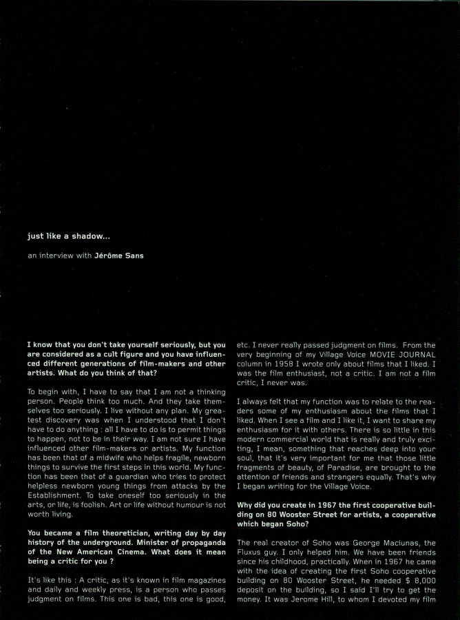 "Jonas Mekas's collection of film snippets is loaded with images of the famous -- like Jacqueline Kennedy Onassis and Caroline Kennedy, and John Lennon and Yoko Ono at their Montreal 'bed-in' -- but these are not conventional portraits. In JUST LIKE A SHADOW (Steidl/ Scalo, $29.95), sequences of three or four film frames, often sliced randomly midframe, are presented with sprocket holes and scratchy optical soundtracks intact. Mekas's images are jerky with movement, either washed out or underexposed, and seemingly shot from the hip, but all have a feeling of spontaneity and the immediacy of life. Norman Mailer's quizzical, pained expression is juxtaposed against the American flag; the ailing but indomitable George Maciunas, the founder of the Fluxus art movement that links many of the subjects in the book, is shown smiling in his hospital bed. There is a marvelous sense of intimacy to Mekas's art of simply filming experience: a sequence of his young son vying with a large ginger cat is an ephemeral yet timeless moment. 'My film work is one long film which is still continuing,' Mekas says in an interview with Jerome Sans. 'I don't really make films: I only keep filming. I am a filmer, not a filmmaker.'"